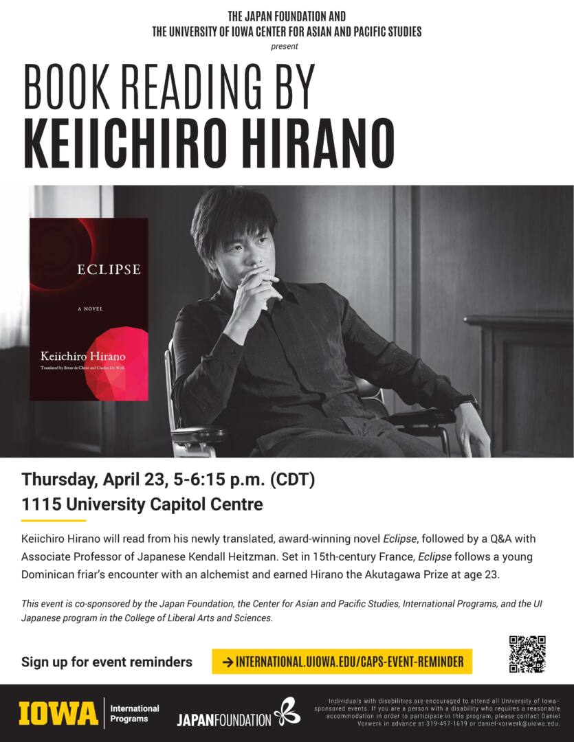 For more information: Book Reading by Keiichiro Hirano | International Programs | The University of Iowa